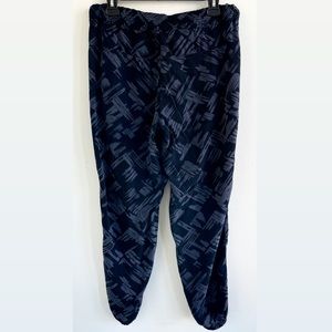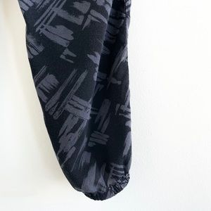 Super comfy and cute joggers with an understated abstract print in gray and black. I love this brand from Anthropologie — Daughters of the Liberation. In good used condition: there is a bit of natural pilling due to the Jersey fabric, but that is by design. No other overt flaws. 17” across at elasticized waist and 25” inseam.