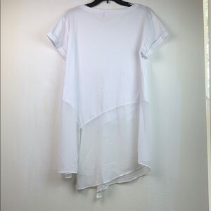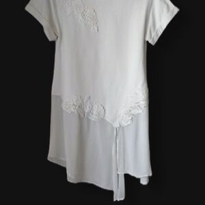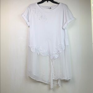 Embroidered appliqué flowers and sheer chiffon asymmetrical trim complete this T shirt weight tunic top.