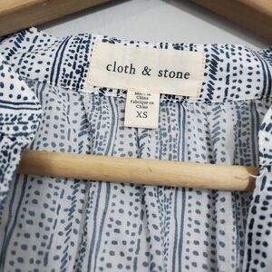 Pre-owned Anthropologie Cloth & Stone shirt, size extra small. The fabric content tag has been cut, but the material is lightweight with no stretch, buttons down in the front, and it comes in a navy and white polka dot/striped pattern. It's in excellent condition, no stains, rips, etc.