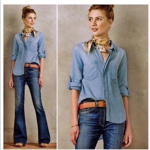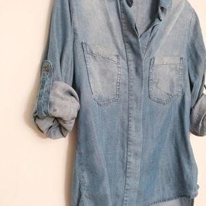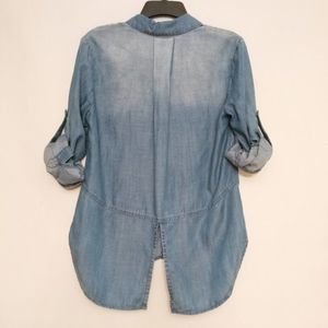 Anthropologie Cloth & Stone Chambray Button Up Blouse. This shirt is super soft made with 100% Tencel. It has concealed button front, spread collar, two breast pockets, back pleat, rolled tab sleeve, long sleeves, high low hem, split tail. Can wear sleeves rolled up or down.