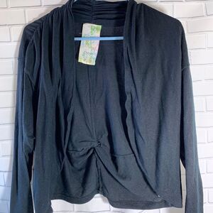 This is a cute cardigan sweater, crop styling, witha shawl styled collar and twisted tie detailing on the lower back. Measures approximately In very good pre-owned condition. Normal wear and tear noted, but no flaws or damage. Please review pictures and feel free to ask any questions or for more pictures prior to purchasing. (I)