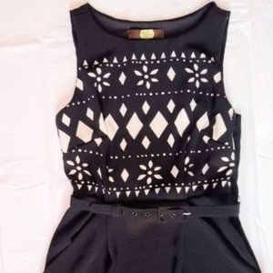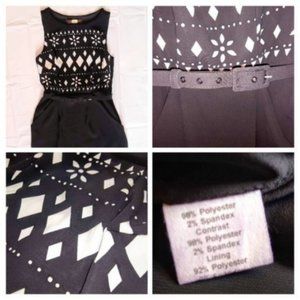 Classically chic with modern trend this monochromatic mini dress is ultimately stylish for any occasion. Beautiful timeless black sheath dress with geometric cutout bodice with striking white contrast slip. Sleeveless. Fitted bust with a narrow waist accented by thin black belt. Sleekly flowing to a pocketed skirt with expertly pleated front & inverted pleat at hem gives a drop dead gorgeous hourglass figure.
