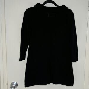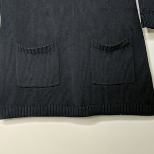 Black knit sweater has two front pockets. Ribbed neck, hem, and cuffs. Three-quarter (3/4) length sleeves. Tunic length. Pulls on over head.