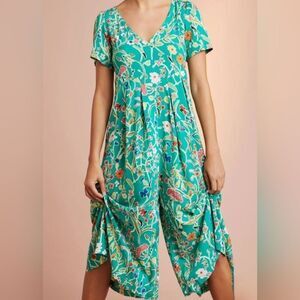Anthro Floreat Green Yardley Floral Sleep Jumpsuit Wide Leg Cropped Summer Boho