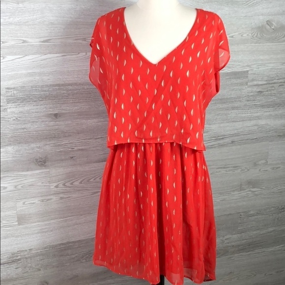 Orange with gold shimmer accent. Waist has elastic stretch waistband. Great sorority recruitment and wedding guest dress.
