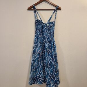 Anthropologie HD in Paris Acropora Blue Coral Fit & Flare Dress. This dress has a sweetheart neckline, criss-cross back, smocked sides and back, is fully lined, has a hidden back zipper and is an above the knee length. It’s in excellent preowned condition.