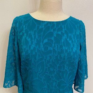 Beautiful dress by Anthropologie brand HD in Paris. Wide, elbow length sleeves. Lined body. Textured pattern in a flattering cerulean color. There is a tiny rip on the back by the tag. I think it could be an easy fix for a sewer, though unfortunately I am not. :) Otherwise great condition. Size small. Would be perfect for a winter holiday party.