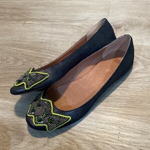 Stylish black flats with intricate beadwork. Perfect for adding a touch of elegance to any outfit.