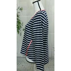 Anthropologie Lili’s Closet Stripe Top XS Specifics: Zip detail boxy tunic, tee top, long sleeve, casual, striped, machine wash, high low; Material: 65% cotton, 35% polyester; Color: Blue, white with pink trim; Size: XS.