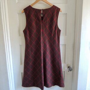 Anthropologie Maeve brown & red silk blend shift dress, size 12. Classic jumper is chocolate brown with overall red plaid diamond pattern. Sleeveless, with an A-line, shift design, round neck with brown button detail, and tiny gathers at yoke. Back has elegant keyhole closure. Fully lined. Simple and chic, with a bit of a 90s schoolgirl vibe. Very good gently pre-owned condition.