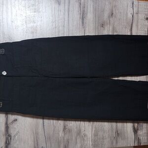 Cropped, wide leg pants in a stretchy fabric with front and back patch pockets. High waist. No flaws or signs of wear. Waist is approx 14 inches, rise is approx 12 inches, inseam is approx 23.5 inches. Excellent condition.