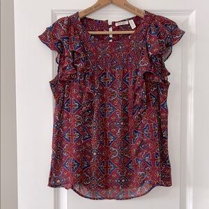 Anthro Meadow Rue Majolica Flutter-Sleeve Smocked Top w MEASUREMENTS! SZ 10