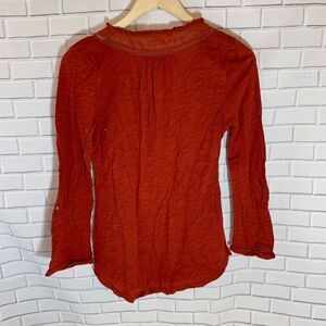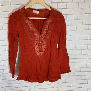 This is a great top for cooler weather, in a rich orange hue with crochet trim at neckline and bodice. There is a sleeve button for rolling up your sleeve. Measures 18" laid flat at underarms, 25" in length. In very good pre-owned condition. Normal wear and tear noted, but no flaws or damage. Please review pictures and feel free to ask any questions or for more pictures prior to purchasing.