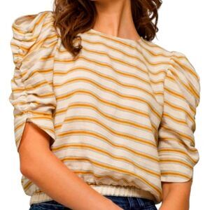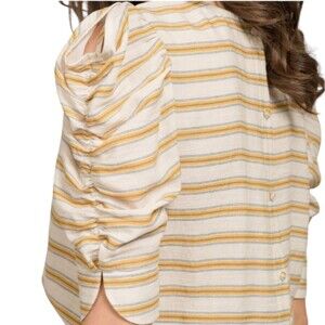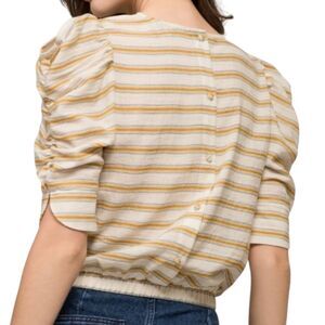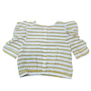 Anthro Moon River Linen Type Material and Feel Puffed Sleeve Top Crop Elastic Waist Yellow Cream Beige Stripe Button Back