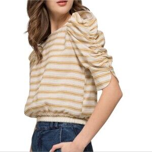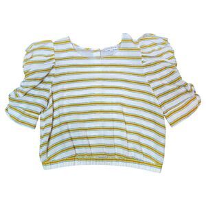 Anthro Moon River Linen Puffed Sleeve Top Crop Elastic Waist Yellow Stripe L