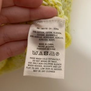 This is a great Moth Sweater from Anthropologie. Neon yellow color. Chunky, cable knit. Two pockets on the front. 3/4 length sleeves. Crewneck. Neon Yellow color. Last photo is strictly for fit reference, actual sweater being sold is yellow. Great condition, no flaws. Material content: 70% cotton and 30% acrylic.