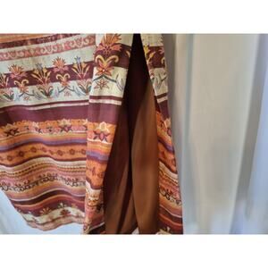 The Maison Tara Spice Paprika Orange Geo Top Skirt Set in US size 14 is a stylish and versatile two-piece outfit perfect for casual or business occasions in the warmer seasons of summer and spring. Made from cotton with a blended fabric texture, this set features a geometric pattern in vibrant multicolor hues, making it a standout addition to any woman's clothing collection. The short sleeve top and skirt together offer a comfortable and fashionable look that embodies the brand's quality and designer touch.