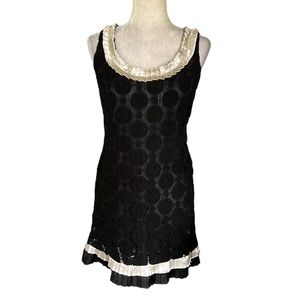 Adorable Anthropologie Vintage Nick & Mo Black Crochet Knit Ivory Satin Ruffle Mini Dress