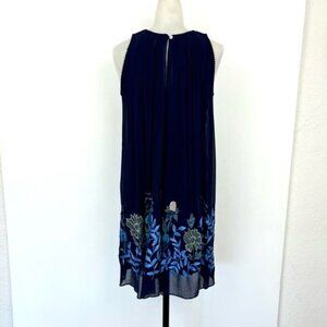 Embroidered navy blue dress, hits a few inches above the knee. Sheer layer with 2 layers of lining.