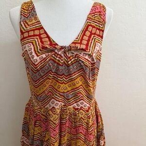 This Anthropologie sundress in orange and brown is perfect for casual outings, featuring a sleeveless design with a scoop neckline. The midi-length dress offers a comfortable fit with its light, breathable fabric and a flowing skirt that adds a touch of elegance.