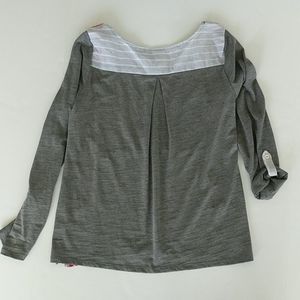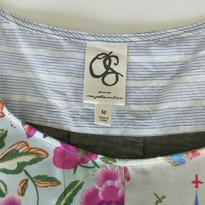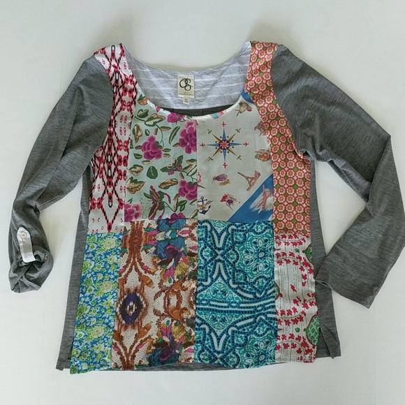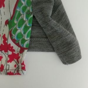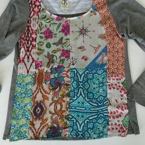 Beautiful One September Anthropologie brand. Light polyester front with travel, flowers and patterns on grey. Long sleeve with roll up buttons on sleeves.
