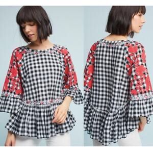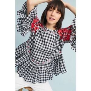 Anthro Pankaj & Nidhi Gingham Print Floral Ruffle Blouse