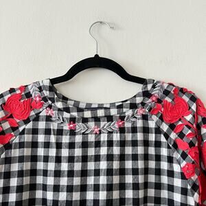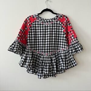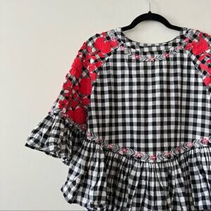 In good preowned condition. A cute gingham top with ruffle details and floral appliques. Embroidered trim. From Anthropologie.