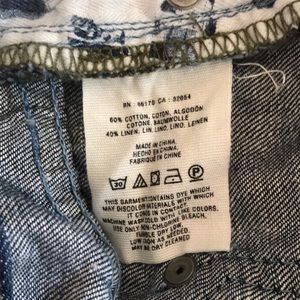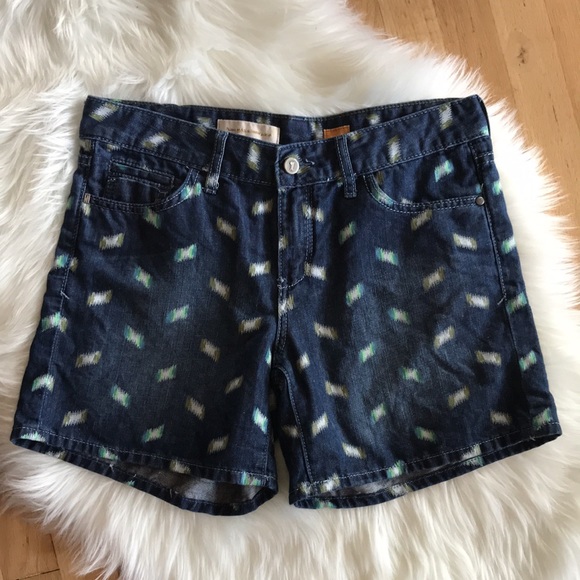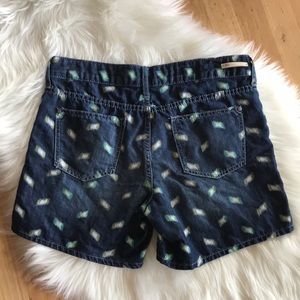 Anthropologie’s Pilcro and the Letterpress brand denim jean shorts. Medium wash, with abstract brushstroke pattern, in shades of green and white.