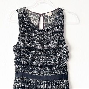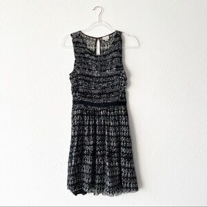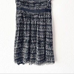 Anthropologie Postage Stamp fit and flare mini dress. Mesh material, empire waistline, black and white printed. The lining is hanging down just a tad on the backside (see pic) but overall great condition.