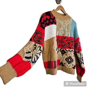 Anthropologie bohemian cable knit multi pattern crew puff sleeve sweater