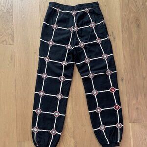 Cute black cotton jogger pants with red, white embroidery. They are in excellent pre-owned condition and come from a smoke and pet-free home.