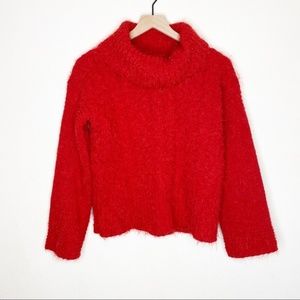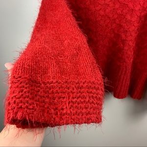 Fuzzy, large cowl neck, crisscross bodice, warm, cozy, holiday, Christmas,snow, snowy, winter, oversized, boxy, bright red, cherry, outdoors, anthro