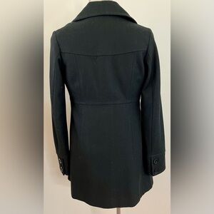 Anthro Tulle brand wool blend long black coat in a women’s L. True to size, would fit a size 8 - 10. Features 4 large button front, 2 button cuffs, side pockets, satin lining and pin tucking for an hour glass shape.