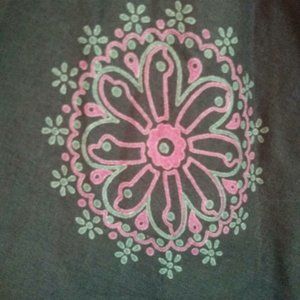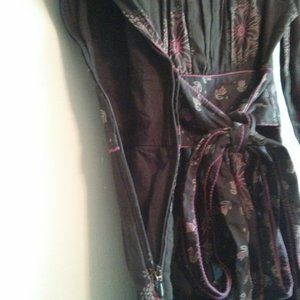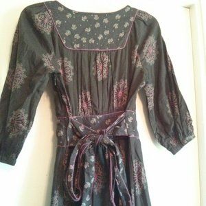 Brown cotton dress with pink and green floral/folk/ethnic print. Waist and flattering bodice seam details. Lined-has an almost petticoat like underlayer. Flattering attached self belt can be tied in bow or wrapped around front or back. Side Zip. Three quarter sleeves w/ functional button. Good preloved condition.