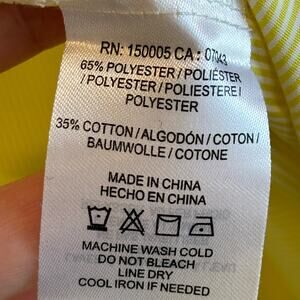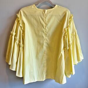 Dramatic, voluminous 3/4 ruffle sleeves. Oversized fit. Yellow and white micro stripe. Hidden zip up the back.