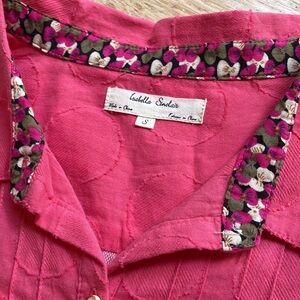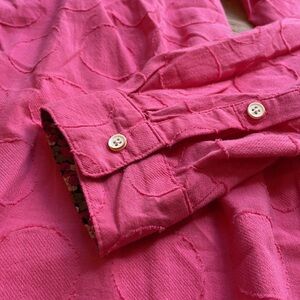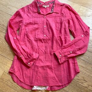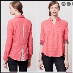 Coral long sleeve tab shirt that can either be worn "down" or rolled up. Has romantic lace insert on back and button down on chest. Collared shirt has large polka dot detail. Nice feminine touch! Measurements are shown in photos. Top has no stains, rips or holes. First 2 photos are stock photos.
