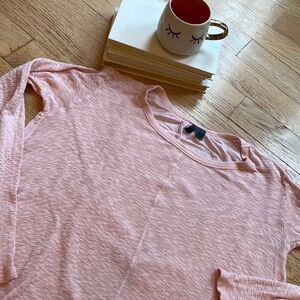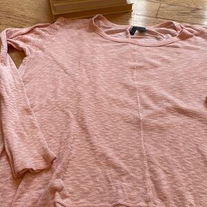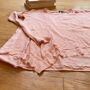 Long-sleeve top has a light sweater-like front with fabric back. Bottom is asymmetrical, has a round neck and is flown. Perfect for jeans or leggings. See photos for measurements. Listing is for top only. Top is in excellent condition, no rips, holes or stains.