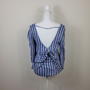 Anthro Drew Striped Blouse in a beautiful blue hue. This blouse features a charming bow detail and an open back design, adding a playful yet elegant touch. The flutter sleeves provide a soft, feminine silhouette, making it perfect for both casual and dressy occasions. With its unique design and timeless stripes, this blouse is a standout piece that brings effortless style to your wardrobe.