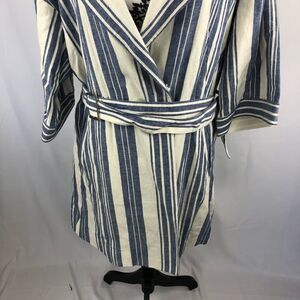 Anthropologie Elevenses North Channel Jacket size small. Blue and white striped linen with foldover collar. Button closure and half wide sleeves. Adjustable belt with knee length. Front pockets. No holes or stains. Perfect for layering!