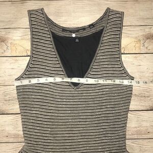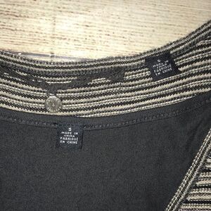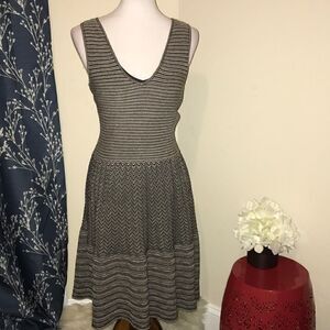 Great, preloved condition. Anthropologie | Knitted and Knotted Test Pattern Sweater Dress. Tan, gray, black, and metallic. Pullover. Attached lining. Body: 44% cotton, 34% wool, 16% rayon, 4% polyester, 2% metallic. Lining: 100% rayon.