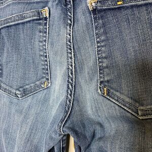 •Features: Medium wash mid rise skinny jeans with factory fading and whiskering. Fabric has stretch.