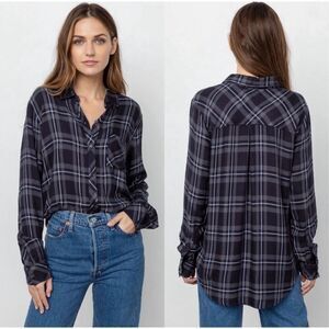 Rails Hunter Plaid Flannel in Grey Midnight Sky. Buttery-soft fabric patterned in rustic plaid forms a relaxed button-front shirt perfect for layering over and under other pieces all year round. In excellent condition. No holes, rips, or stains. Ours is a pet & smoke free home.