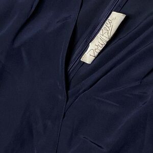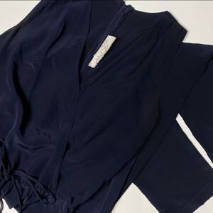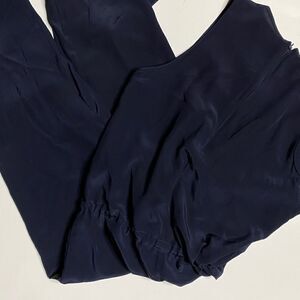 XS. Navy. Silk. Excellent gently used condition. Adjustable Elastic cinch drawstring waist that ties into a bow. Deep V neckline. Laying flat, unstretched:
