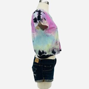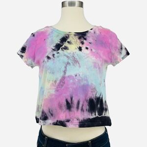 YAYA Nom de Plume by Anthropologie. LIMITED EDITION. Super cool Short Sleeve Tie Dye Tulip Crop Tee in unique pastel colors. Shades of blue, pink, purple, green, and yellow. Open tulip back. Cropped length. Quality t-shirt material is soft inside & out. Perfect for summer, especially beach. Pairs best with updo. Rare gem! Discontinued style. Smoke-free and pet-free home.