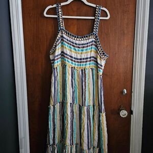 Embrace vibrant style with this striped multicolor maxi dress. Perfect for any occasion, this dress features a blend of blue, yellow, and cream hues. Enjoy a comfortable and chic look all day long.