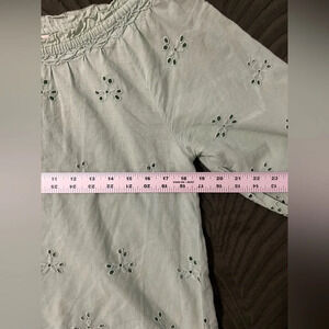 Anthroplogie THML sage green eyelit blouse size small Off the shoulder design Button in the back Quarter sleeves Eyelit design Not lined 100% cotton Excellent used condition Comes from a clean smoke free home!