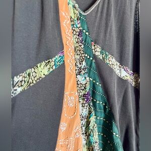 Features beadwork on the orange strip of patchwork. Flattering, flowy fit