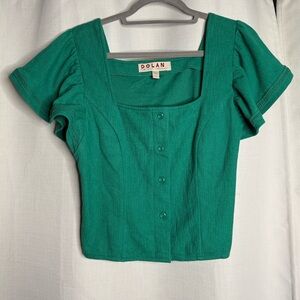 Anthropolgie Dolan Green Left Coast Structured Flutter Top. Kelly green color. Flutter sleeve. Button front. Square neckline. Stretchy, textured soft fabric. Size Small (could easily fit a Medium).