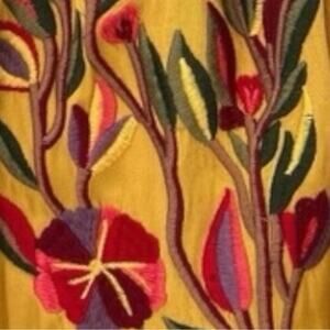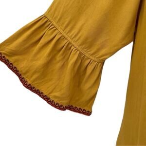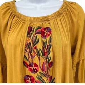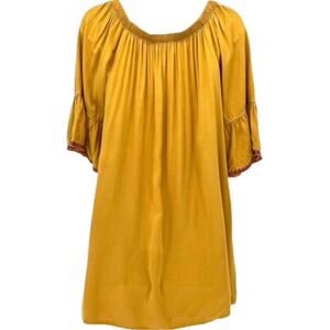 Anthropologie Solitaire Floral Embroidered Boho Shift Dress Flare 3/4 Sleeve Gold Size Medium