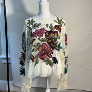 Anthropologie 2X The Layla Long Sleeve appliqué Mesh Blouse in cream